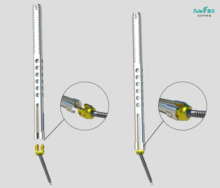 将持钉器顺椎弓根钉臂放入到达合适位置,会有响声反馈,随后扭入护套,增加强度,配合后续工具的使用更加安全。
